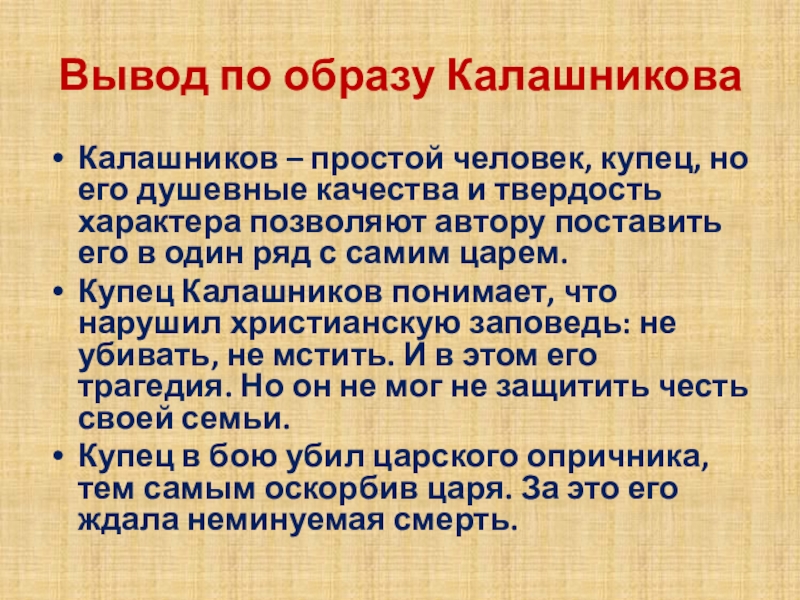 Купец Калашников понимает, что нарушил христианскую заповедь: не убивать, не мстить. И в этом его трагедия. Но он не мог не защитить честь своей семьи.