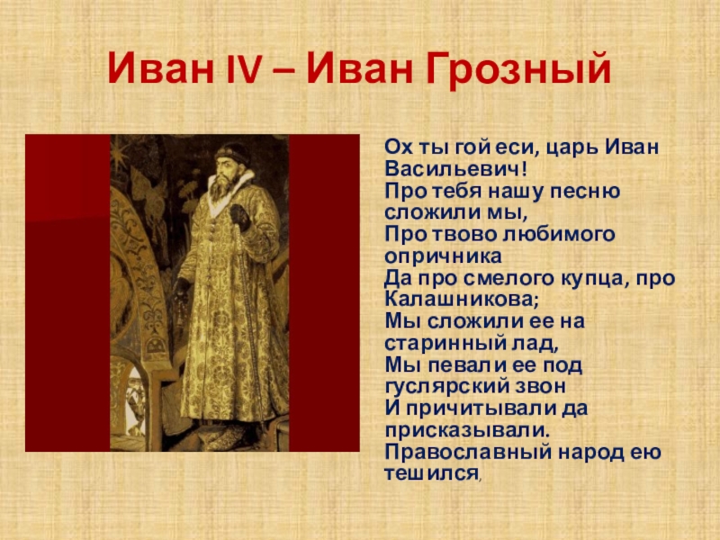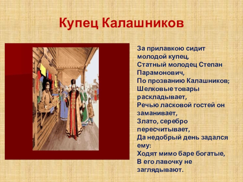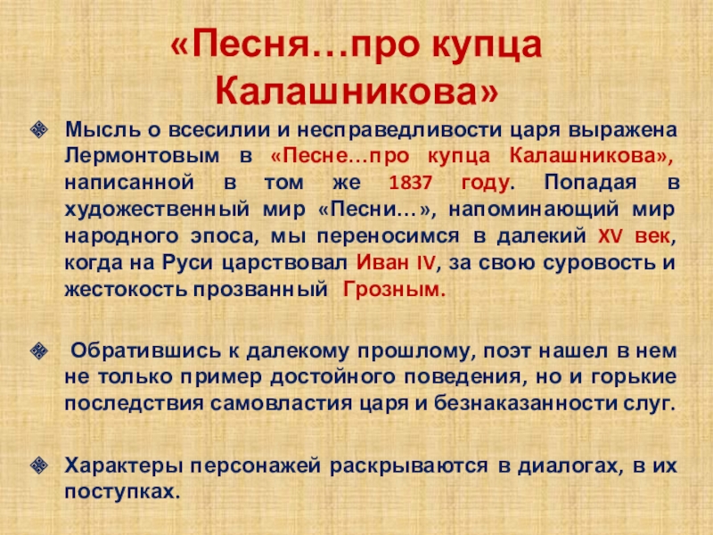 «Песне…про купца Калашникова», написанной в том же 1837 году. Попадая в художественный мир «Песни…», напоминающий мир народного эпоса, мы переносимся в далекий XV век, когда на Руси царствовал Иван IV, за свою суровость и жестокость прозванный Грозным.