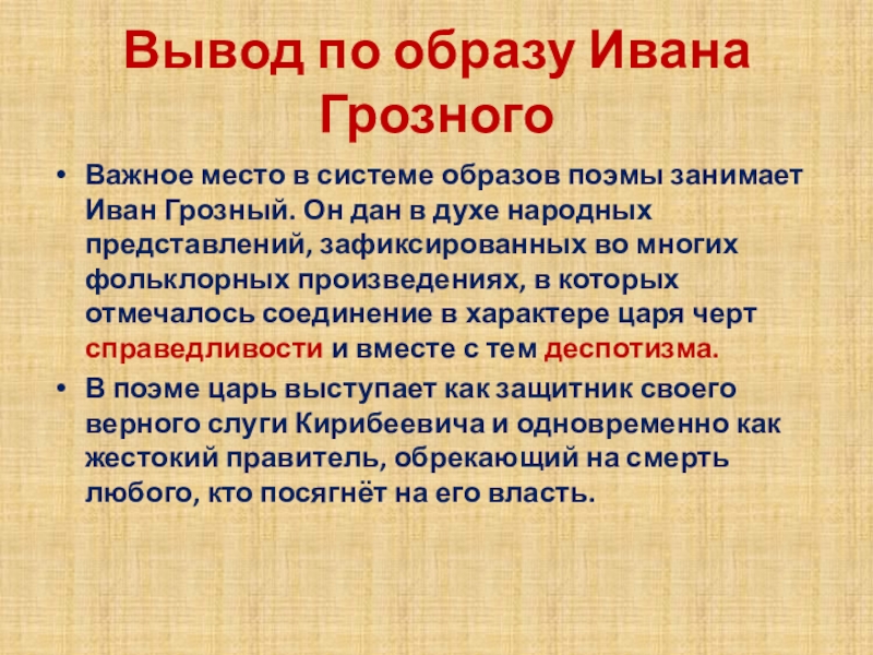 Иван Грозный. Он дан в духе народных представлений, зафиксированных во многих фольклорных произведениях, в которых отмечалось соединение в характере царя черт справедливости и вместе с тем деспотизма.