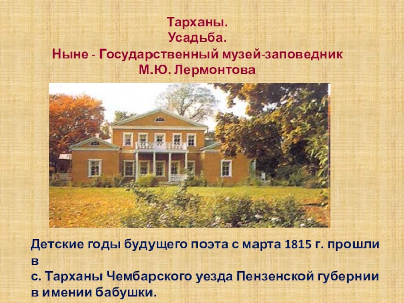 Тарханы Чембарского уезда Пензенской губернии в имении бабушки.