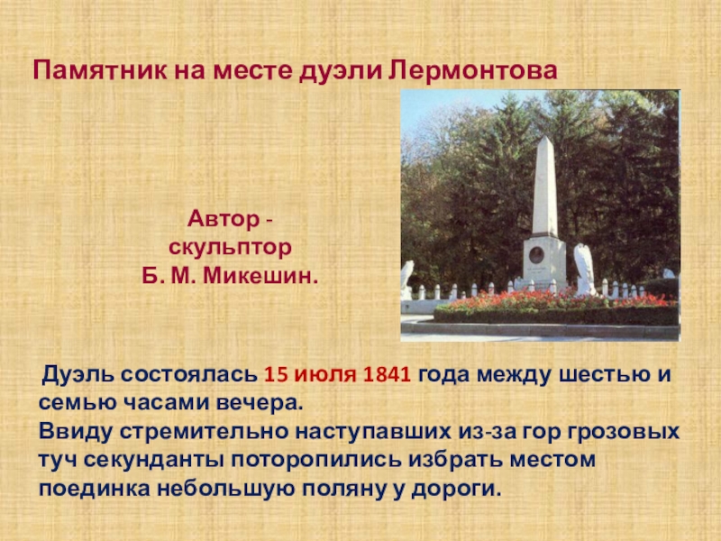Ввиду стремительно наступавших из-за гор грозовых туч секунданты поторопились избрать местом поединка небольшую поляну у дороги.