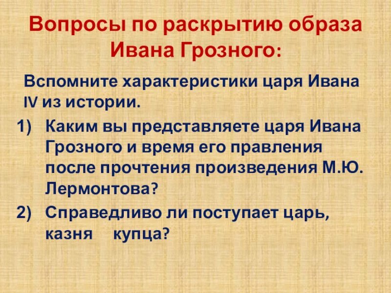 Слайд 26Вопросы по раскрытию образа Ивана Грозного: