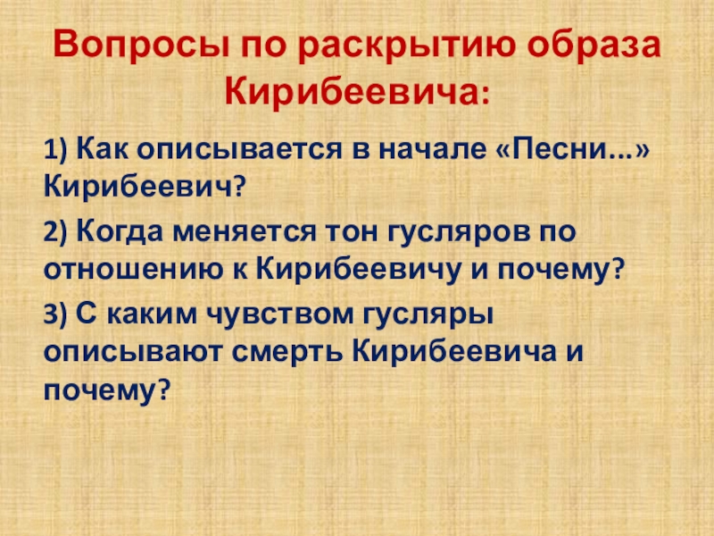 Слайд 24Вопросы по раскрытию образа Кирибеевича: