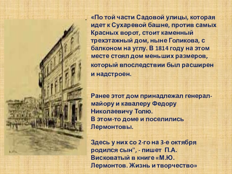 самых Красных ворот, стоит каменный трехэтажный дом, ныне Голикова, с балконом на углу. В 1814 году на этом месте стоял дом меньших размеров, который впоследствии был расширен и надстроен.