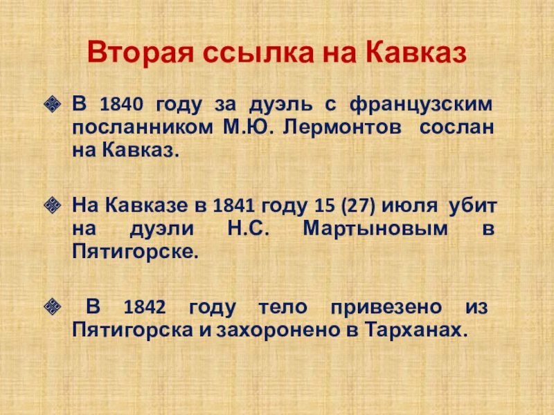 На Кавказе в 1841 году 15 (27) июля убит на дуэли Н.С. Мартыновым в Пятигорске.
