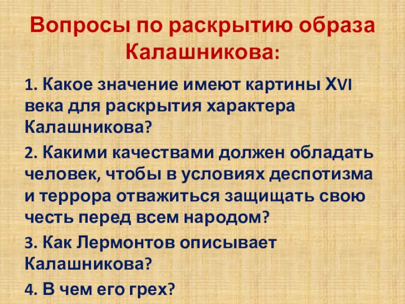 Слайд 22Вопросы по раскрытию образа Калашникова: