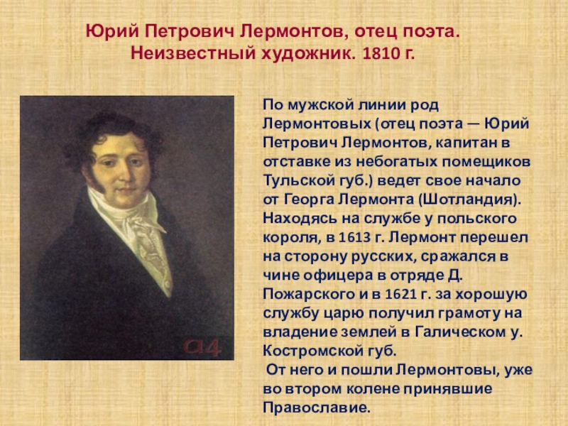 Слайд 5По мужской линии род Лермонтовых (отец поэта — Юрий Петрович Лермонтов,