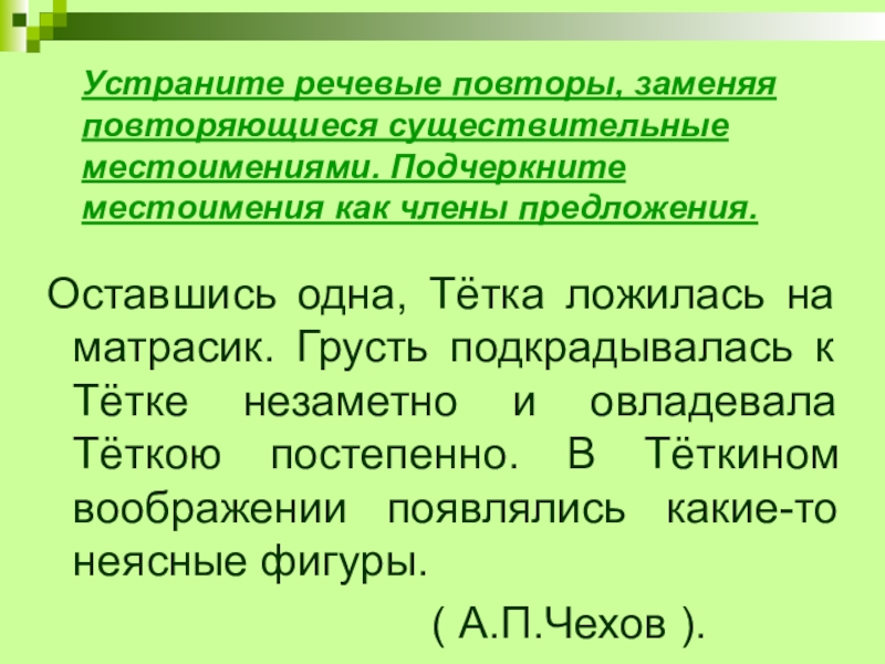 Оставшись одна, Тётка ложилась на матрасик. Грусть подкрадывалась к Тётке незаметно и овладевала Тёткою постепенно. В Тёткином воображении появлялись какие-то неясные фигуры.