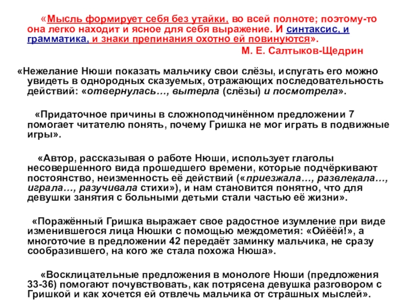 полноте; поэтому-то она легко находит и ясное для себя выражение. И синтаксис, и грамматика, и знаки препинания охотно ей повинуются». М. Е. Салтыков-Щедрин