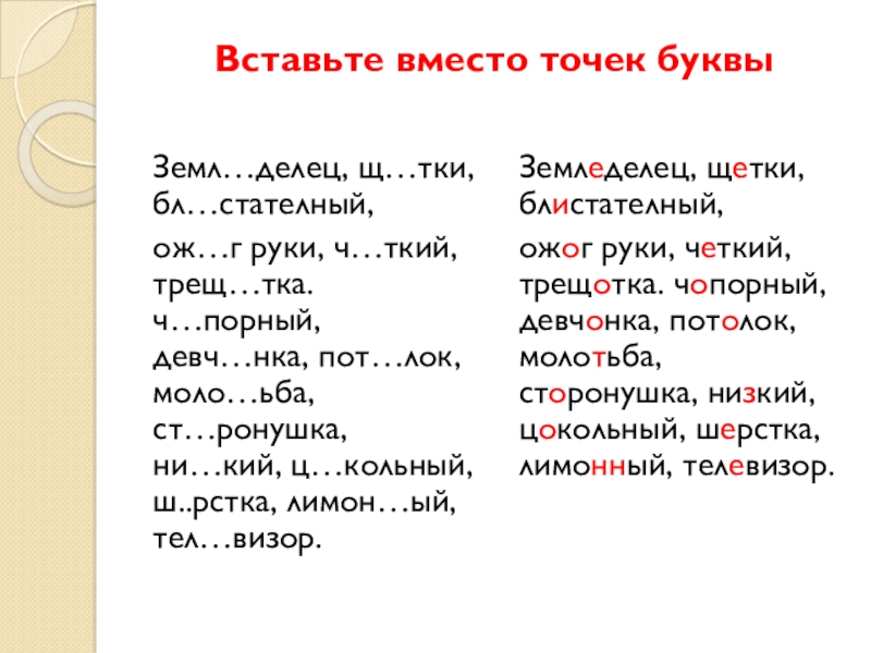 ожог руки, четкий, трещотка. чопорный, девчонка, потолок, молотьба, сторонушка, низкий, цокольный, шерстка, лимонный, телевизор.