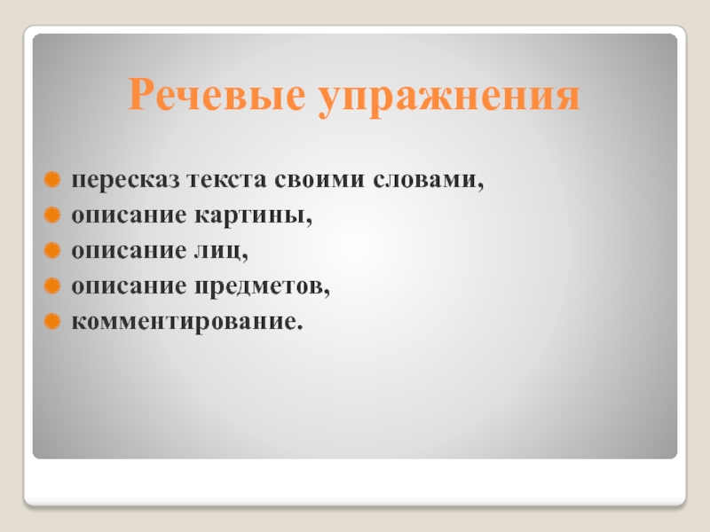 Речевые упражненияпересказ текста своими словами, описание картины, описание лиц, описание предметов, комментирование.