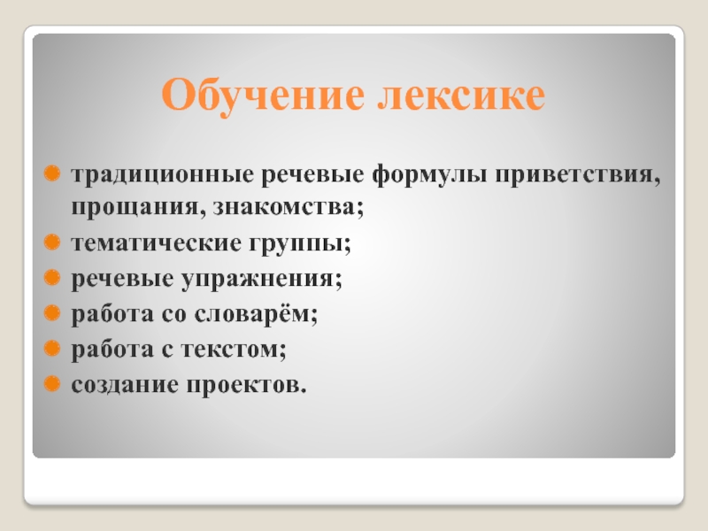 Обучение лексикетрадиционные речевые формулы приветствия, прощания, знакомства;тематические группы;речевые упражнения;работа со словарём;работа с текстом;создание проектов.