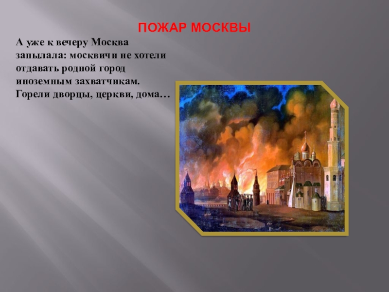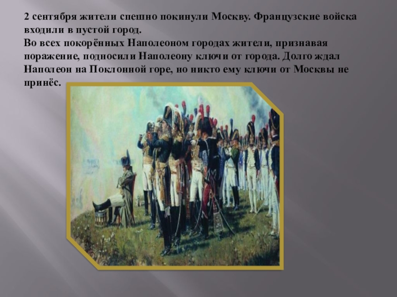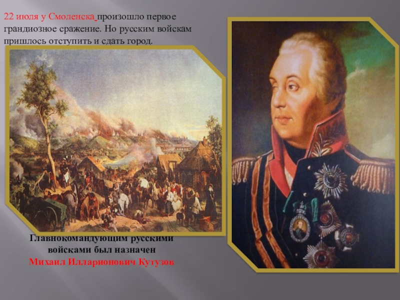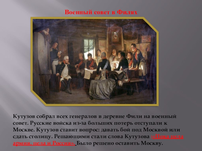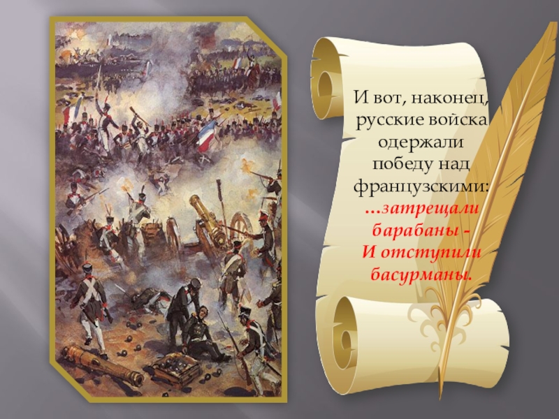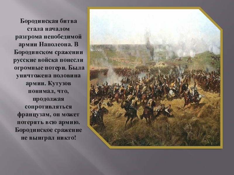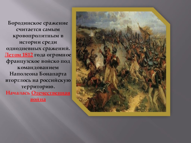 Наполеон собрал 600 - тысячное войско и двинул его к России. «Я иду в Москву, - говорил он, - и в одно или два сражения всё кончу». Наполеон рассчитывал на быструю и лёгкую победу.