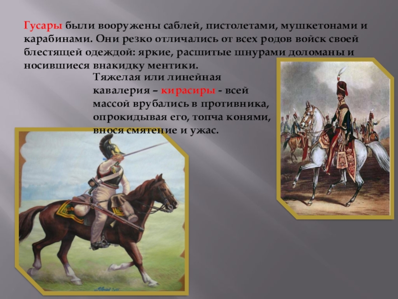 Тяжелая или линейная кавалерия – кирасиры - всей массой врубались в противника, опрокидывая его, топча конями, внося смятение и ужас.