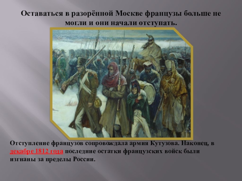 Отступление французов сопровождала армия Кутузова. Наконец, в декабре 1812 года последние остатки французских войск были изгнаны за пределы России.