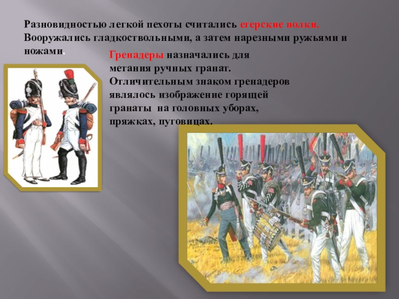 Гренадеры назначались для метания ручных гранат. Отличительным знаком гренадеров являлось изображение горящей гранаты на головных уборах, пряжках, пуговицах.