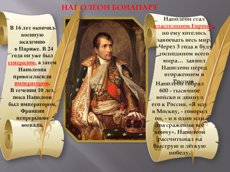 Наполеон стал властелином Европы, но ему хотелось завоевать весь мир. «Через 3 года я буду господином всего мира… заявил Наполеон перед вторжением в Россию.