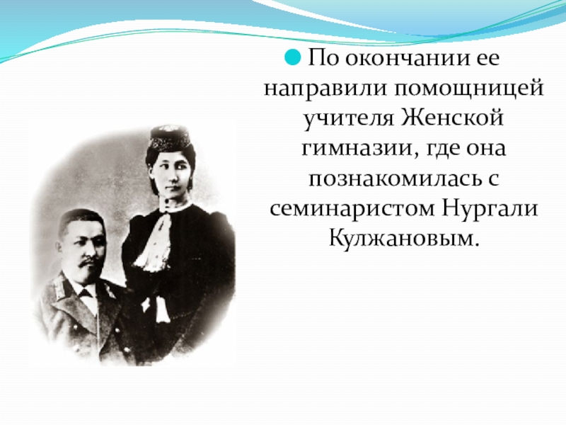 По окончании ее направили помощницей учителя Женской гимназии, где она познакомилась с семинаристом Нургали Кулжановым.