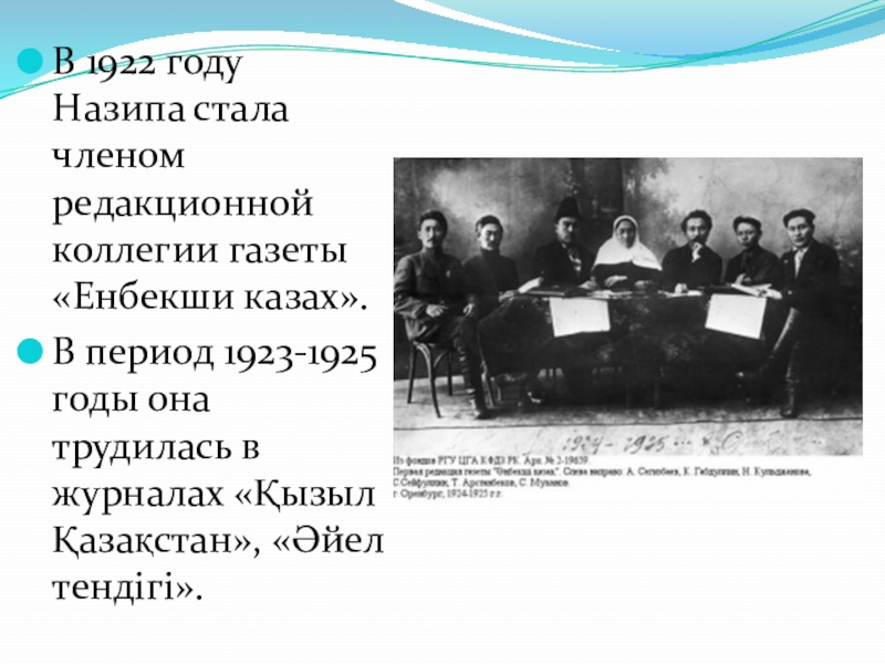 Слайд 7В 1922 году Назипа стала членом редакционной коллегии газеты «Енбекши казах».
