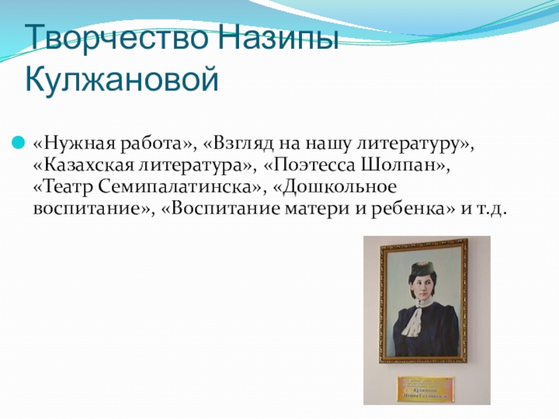 Творчество Назипы Кулжановой«Нужная работа», «Взгляд на нашу литературу», «Казахская литература», «Поэтесса Шолпан», «Театр Семипалатинска», «Дошкольное воспитание», «Воспитание