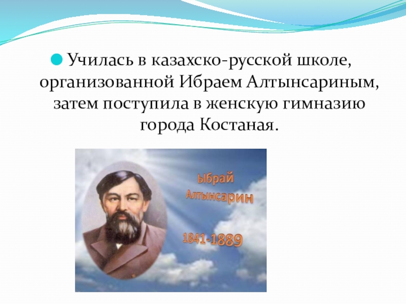 Училась в казахско-русской школе, организованной Ибраем Алтынсариным, затем поступила в женскую