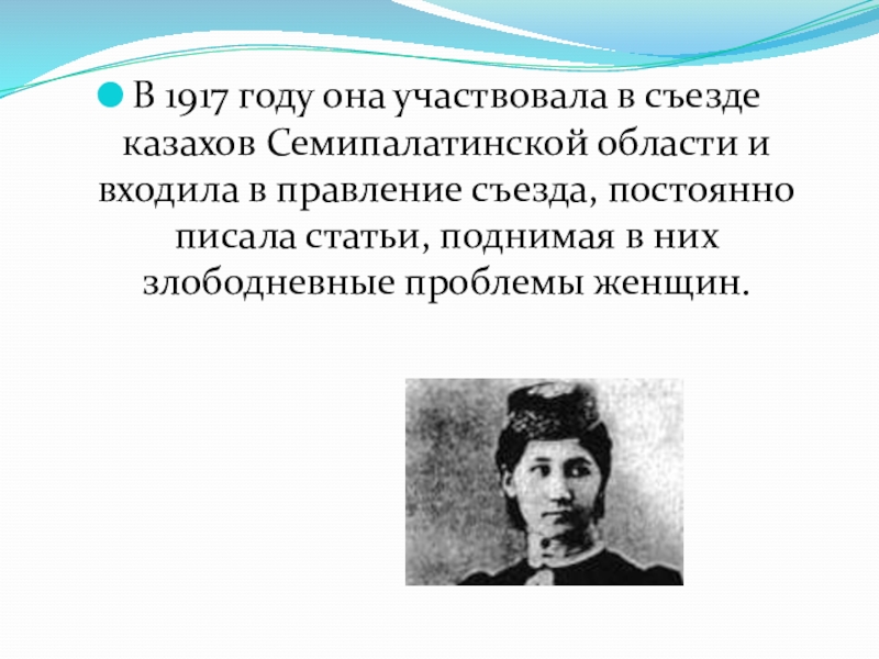 Слайд 6В 1917 году она участвовала в съезде казахов Семипалатинской области и