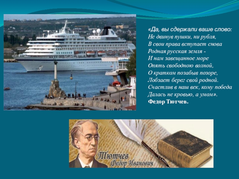 вступает снова Родная русская земля - И нам завещанное море Опять свободною волной, О кратком позабыв позоре, Лобзает берег свой родной. Счастлив в наш век, кому победа Далась не кровью, а умом». Федор Тютчев.