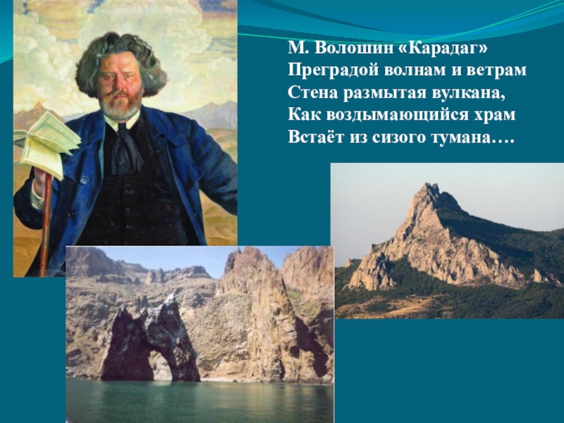 М. Волошин «Карадаг»            Преградой волнам и ветрам Стена размытая вулкана, Как воздымающийся храм Встаёт из сизого тумана….