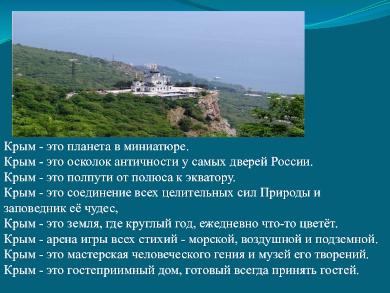 самых дверей России. Крым - это полпути от полюса к экватору. Крым - это соединение всех целительных сил Природы и заповедник её чудес, Крым - это земля, где круглый год, ежедневно что-то цветёт. Крым - арена игры всех стихий - морской, воздушной и подземной. Крым - это мастерская человеческого гения и музей его творений. Крым - это гостеприимный дом, готовый всегда принять гостей.