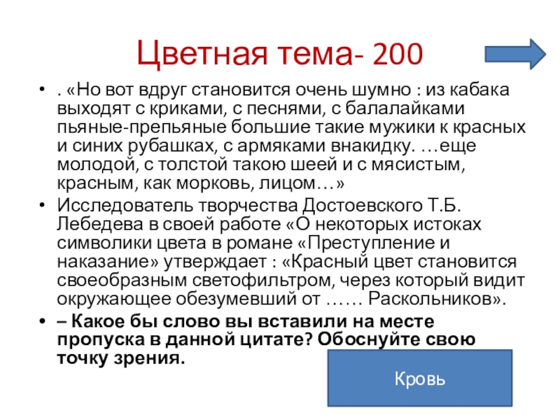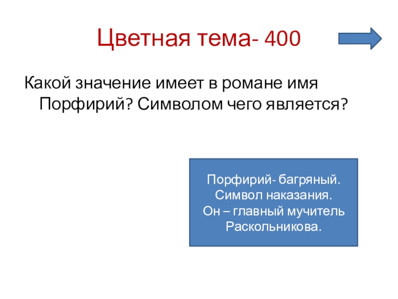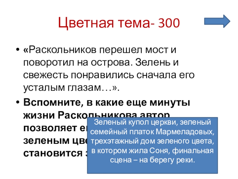 Зеленый купол церкви, зеленый семейный платок Мармеладовых, трехэтажный дом зеленого цвета, в котором жила Соня, финальная сцена – на берегу реки.