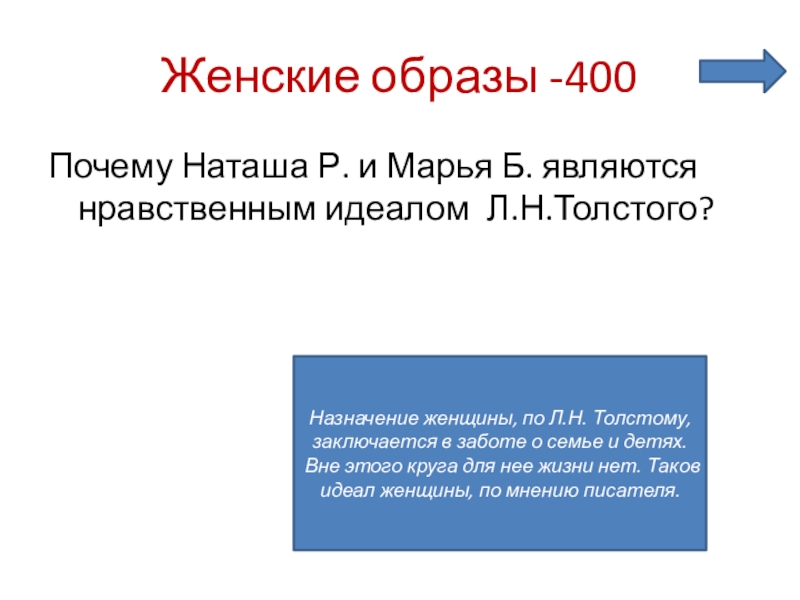 Назначение женщины, по Л.Н. Толстому, заключается в заботе о семье и детях. Вне этого круга для нее жизни нет. Таков идеал женщины, по мнению писателя.