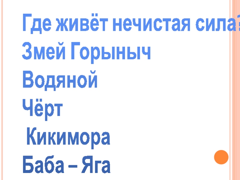 Где живёт нечистая сила?  Змей Горыныч Водяной Чёрт  Кикимора Баба – Яга