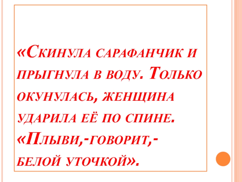 Слайд 15«Скинула сарафанчик и прыгнула в воду. Только окунулась, женщина ударила её