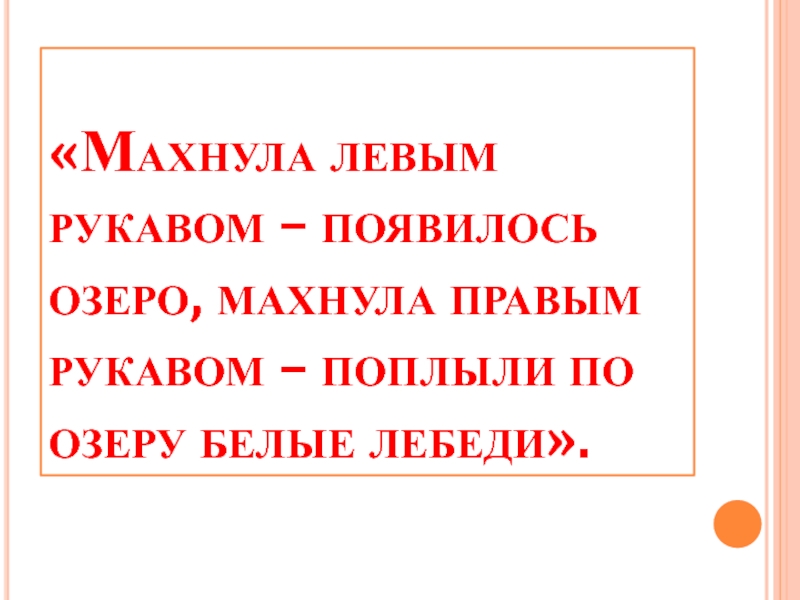 Слайд 21«Махнула левым рукавом – появилось озеро, махнула правым рукавом – поплыли