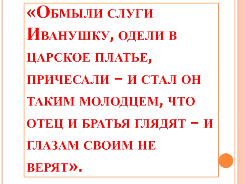 Слайд 23«Обмыли слуги Иванушку, одели в царское платье, причесали – и стал