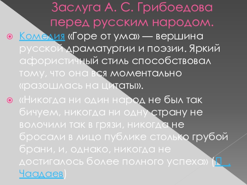 Слайд 12Заслуга А. С. Грибоедова перед русским народом.