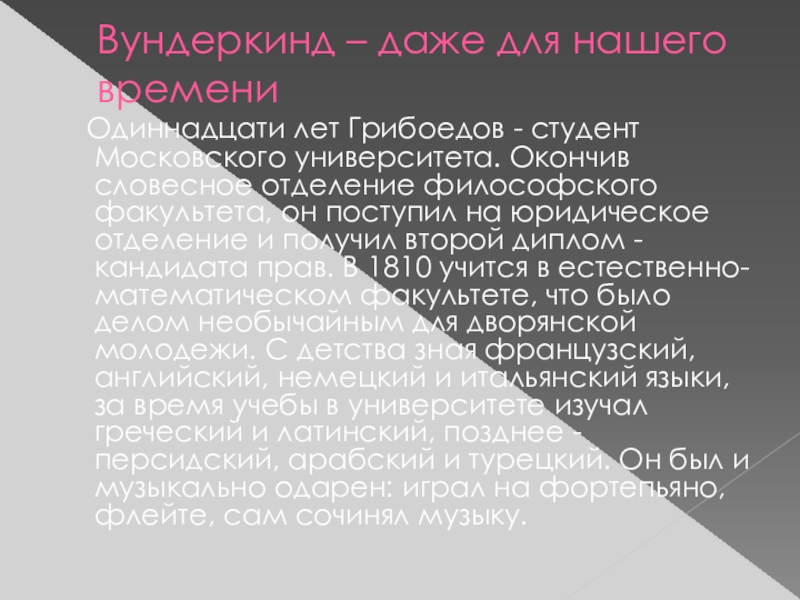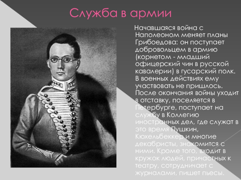 Грибоедова: он поступает добровольцем в армию (корнетом - младший офицерский чин в русской кавалерии) в гусарский полк. В военных действиях ему участвовать не пришлось. После окончания войны уходит в отставку, поселяется в Петербурге, поступает на службу в Коллегию иностранных дел, где служат в это время Пушкин, Кюхельбеккер и многие декабристы, знакомится с ними. Кроме того, входит в кружок людей, причастных к театру, сотрудничает с журналами, пишет пьесы.