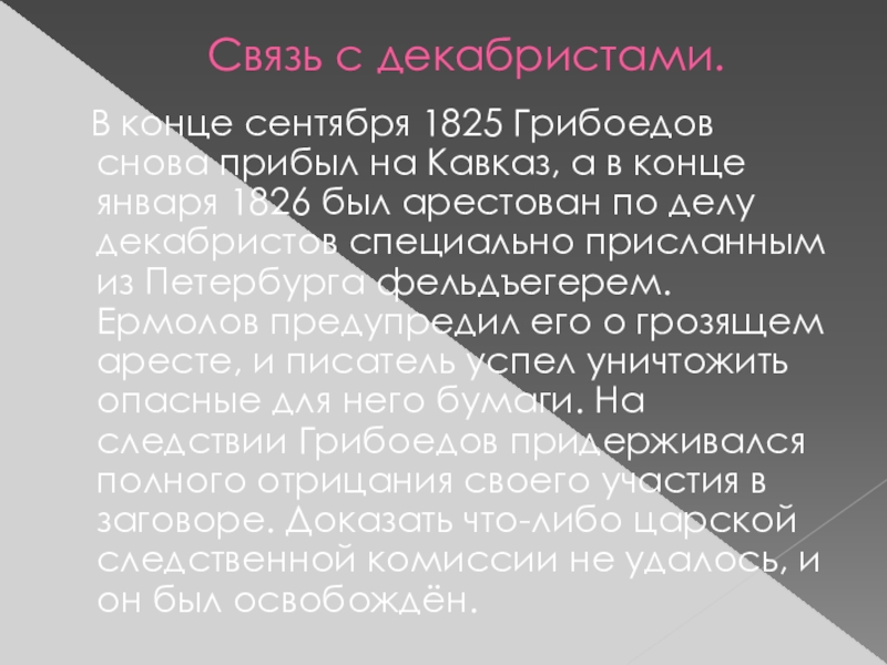 прибыл на Кавказ, а в конце января 1826 был арестован по делу декабристов специально присланным из Петербурга фельдъегерем. Ермолов предупредил его о грозящем аресте, и писатель успел уничтожить опасные для него бумаги. На следствии Грибоедов придерживался полного отрицания своего участия в заговоре. Доказать что-либо царской следственной комиссии не удалось, и он был освобождён.