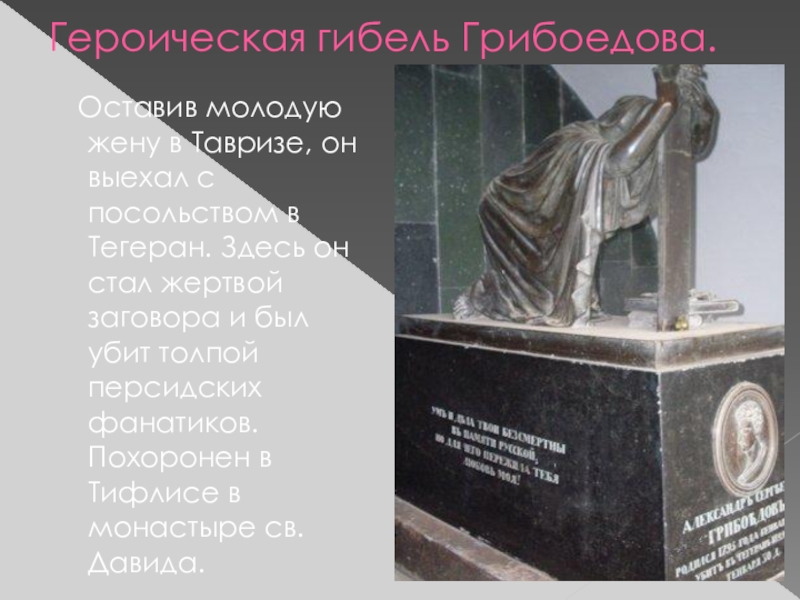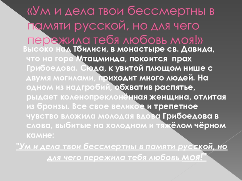 Высоко над Тбилиси, в монастыре св. Давида, что на горе Мтацминда, покоится прах Грибоедова. Сюда, к увитой плющом нише с двумя могилами, приходит много людей. На одном из надгробий, обхватив распятье, рыдает коленопреклонённая женщина, отлитая из бронзы. Все свое великое и трепетное чувство вложила молодая вдова Грибоедова в слова, выбитые на холодном и тяжёлом чёрном камне: