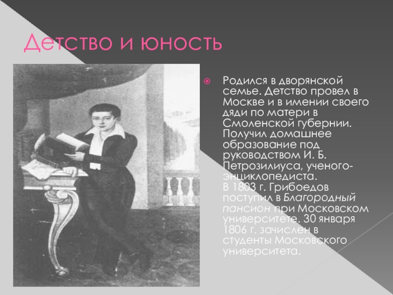 в имении своего дяди по матери в Смоленской губернии. Получил домашнее образование под руководством И. Б. Петрозилиуса, ученого-энциклопедиста. В 1803 г. Грибоедов поступил в Благородный пансион при Московском университете. 30 января 1806 г. зачислен в студенты Московского университета.