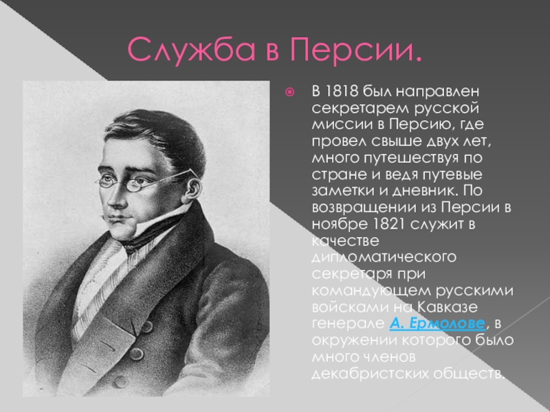 Персию, где провел свыше двух лет, много путешествуя по стране и ведя путевые заметки и дневник. По возвращении из Персии в ноябре 1821 служит в качестве дипломатического секретаря при командующем русскими войсками на Кавказе генерале А. Ермолове, в окружении которого было много членов декабристских обществ.