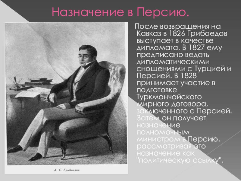 Грибоедов выступает в качестве дипломата. В 1827 ему предписано ведать дипломатическими сношениями с Турцией и Персией. В 1828 принимает участие в подготовке Туркманчайского мирного договора, заключенного с Персией. Затем он получает назначение полномочным министром в Персию, рассматривая это назначение как "политическую ссылку".