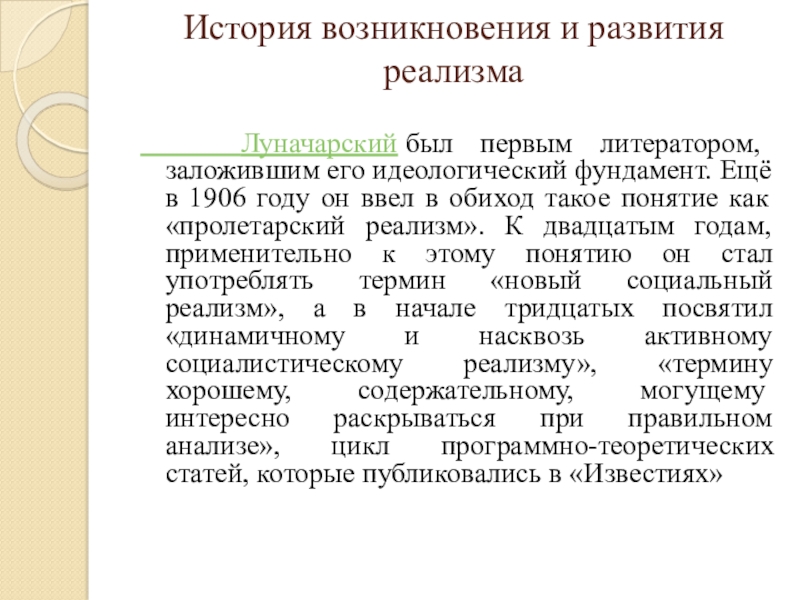 идеологический фундамент. Ещё в 1906 году он ввел в обиход такое понятие как «пролетарский реализм». К двадцатым годам, применительно к этому понятию он стал употреблять термин «новый социальный реализм», а в начале тридцатых посвятил «динамичному и насквозь активному социалистическому реализму», «термину хорошему, содержательному, могущему интересно раскрываться при правильном анализе», цикл программно-теоретических статей, которые публиковались в «Известиях»