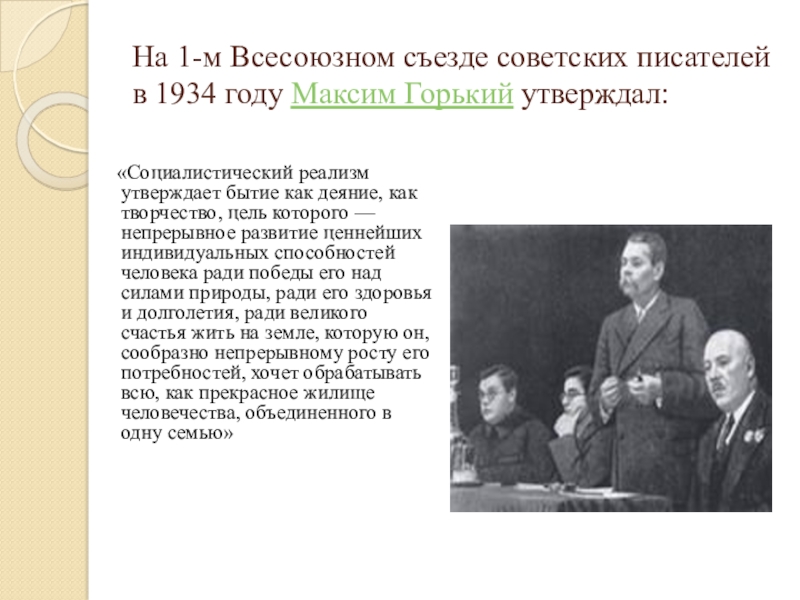 Слайд 8На 1-м Всесоюзном съезде советских писателей в 1934 году Максим Горький утверждал: