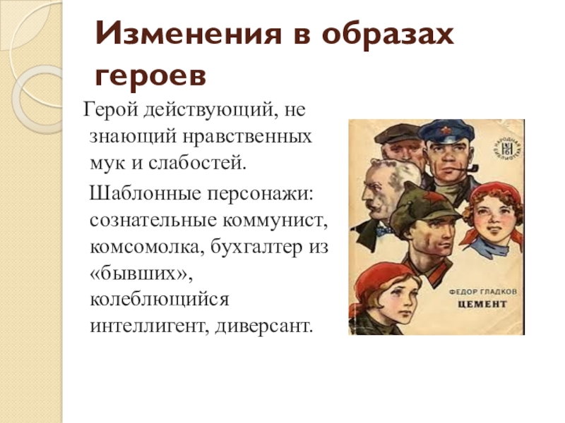 Шаблонные персонажи: сознательные коммунист, комсомолка, бухгалтер из «бывших», колеблющийся интеллигент, диверсант.