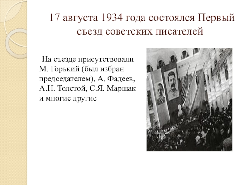 Слайд 4 17 августа 1934 года состоялся Первый съезд советских писателей