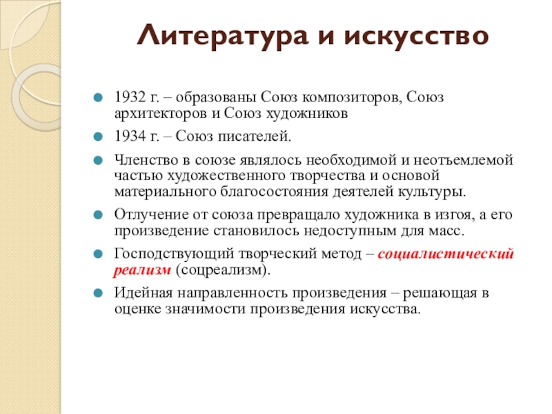 Господствующий творческий метод – социалистический реализм (соцреализм).