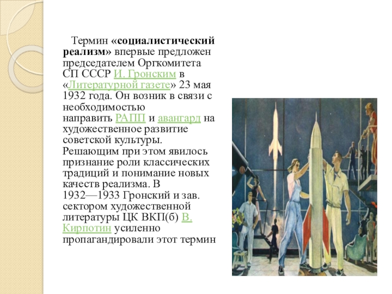 Слайд 7 Термин «социалистический реализм» впервые предложен председателем Оргкомитета СП