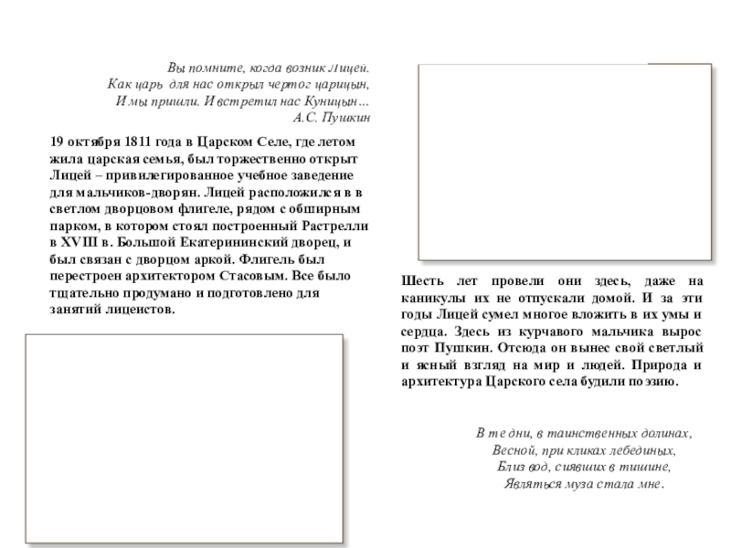 Шесть лет провели они здесь, даже на каникулы их не отпускали домой. И за эти годы Лицей сумел многое вложить в их умы и сердца. Здесь из курчавого мальчика вырос поэт Пушкин. Отсюда он вынес свой светлый и ясный взгляд на мир и людей. Природа и архитектура Царского села будили поэзию.