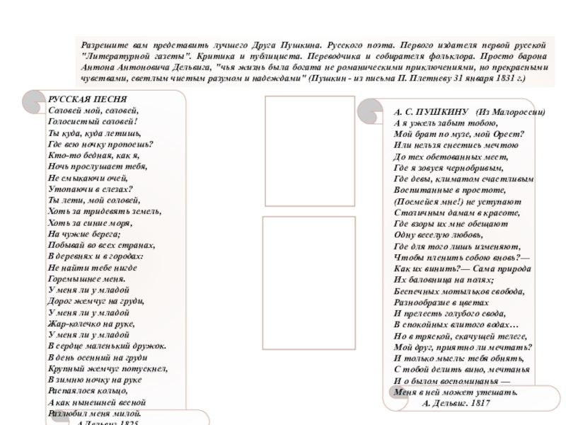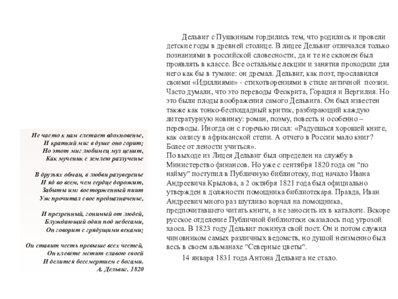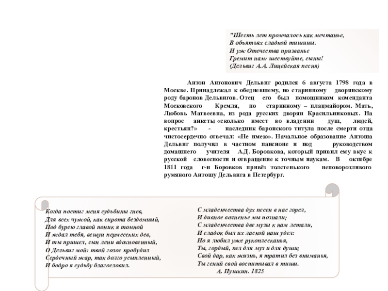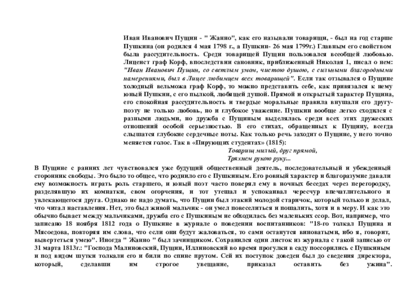 Чувство дружбы, вынесенное Пушкиным из Лицея, одушевляло его всю жизнь. Но представление о дружбе менялось с годами. В стихотворении «Пирующие студенты» (1814) дружба – счастливый и беззаботный союз вольности, свободный от уз и тягот учения и «холодных мудрецов».